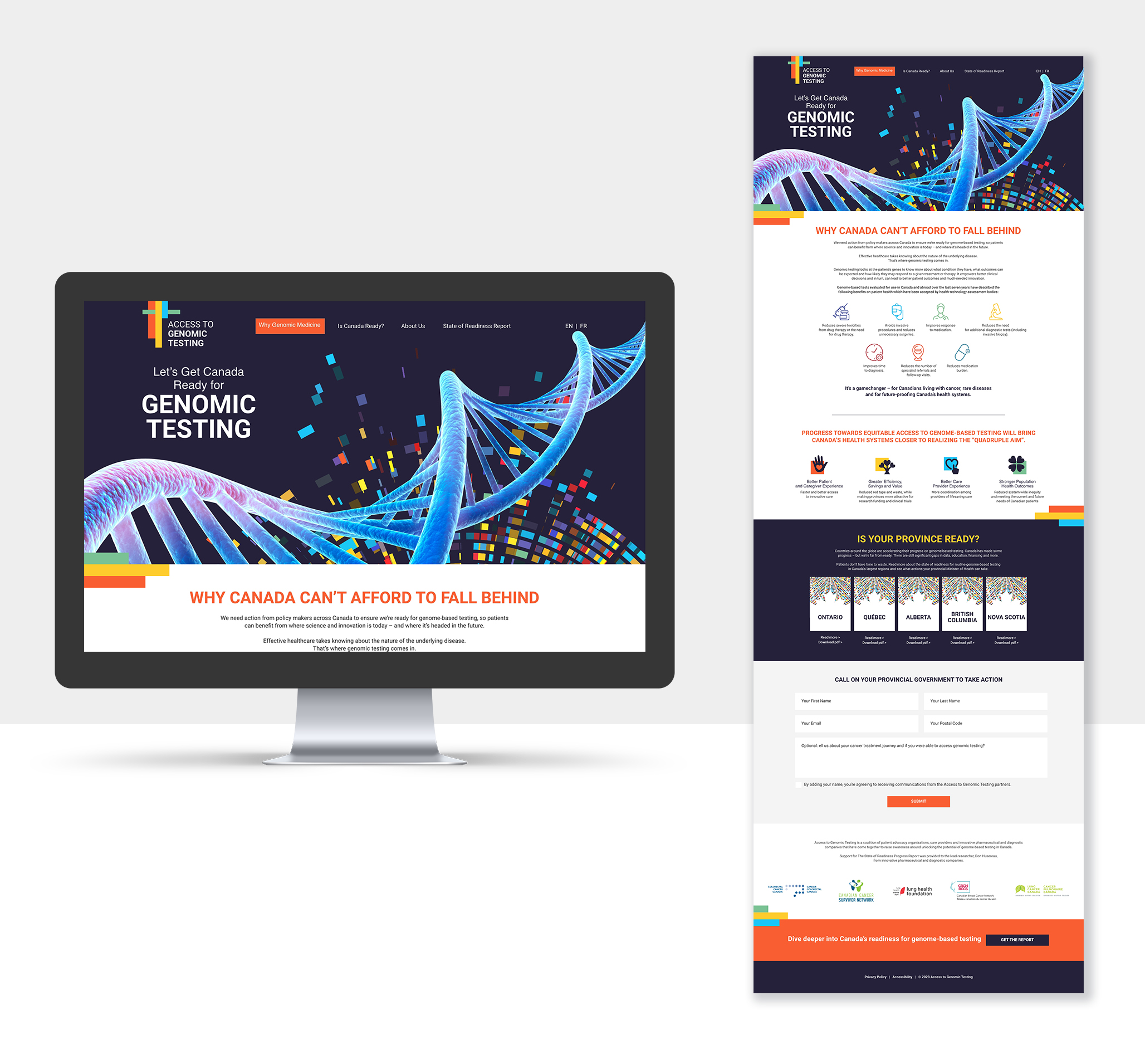 Approach: To raise awareness and drive change, I led the development of a bilingual, integrated campaign that reinforced the findings of The State of Readiness Progress Report by lead researcher Don Husereau. The report revealed that five major provinces—British Columbia, Alberta, Ontario, Quebec, and Nova Scotia—are lagging in both infrastructure and operational readiness to adopt genome-based testing.