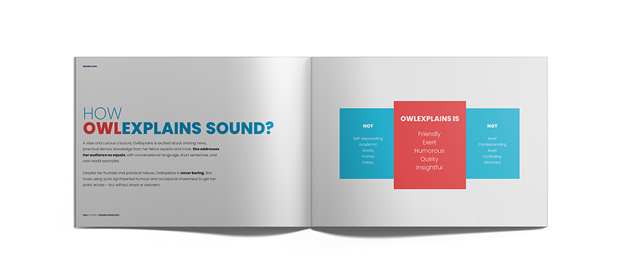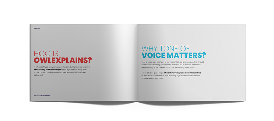 The Brand: In a forest of hype, overpromises, and jargon, OwlExplains is a rare bird: a trustworthy and friendly expert. She’s a guide to all things web3 and blockchain, helping her audience explore possibilities, without getting lost. The owl is wise and curious creature, excited about sharing news practical demos, knowledge from her fellow experts and more. She addresses her audience as equals, with conversational language, short sentences, and real-world examples.
